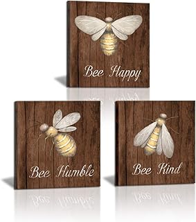 3ピース レトロ 蜂 寝室 キャンバス ウォールアート ポスター 動物画 Be Kind Be Happy Be Humble 写真 昆虫 ポジティブ 引用ポスター 子供部屋 バスルーム ホームデコレーション 12インチ x 12インチ x 3ピース