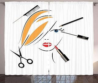 Ambesonne ヘアサロンカーテン ビューティーサロンコンセプト メイクアップ ヘアードコーム リップスティック ハサミ リビングルーム ベッドルーム ウィンドウドレープ 2パネルセット 108インチ x 84インチ ブラックアースイエロー